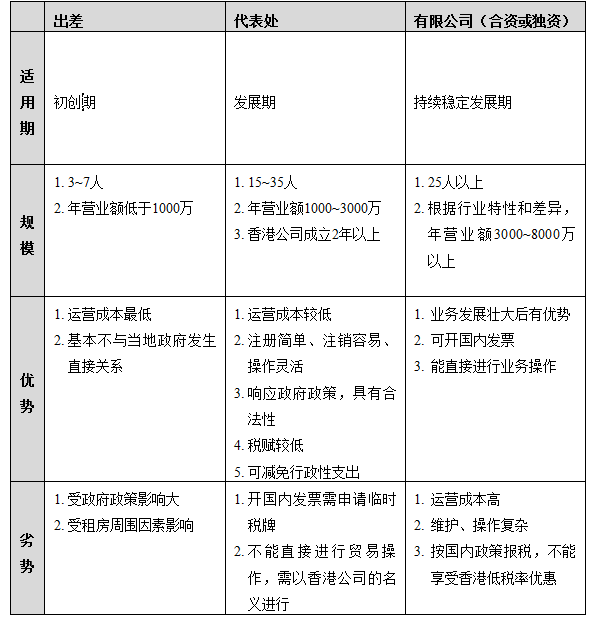 根据内地业务发展情况,离岸公司在国内可以有三种经营方式:随着业务的逐渐扩大,可逐渐由出差方式过渡到设立代表处,最终发展为成立合资(或独资)子公司。三种经营方式的比较结果如下表: 客户可根据实际情况自行选择运作方式。